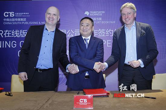 法蘭克福書展主席尤根·博斯,法蘭克福書展副主席、IPR在線版權(quán)交易有限公司總裁托馬斯·明庫斯,湖南出版投資控股集團(tuán)黨委書記、董事長、中南出版?zhèn)髅郊瘓F(tuán)董事長龔曙光共同簽署了合作協(xié)議。